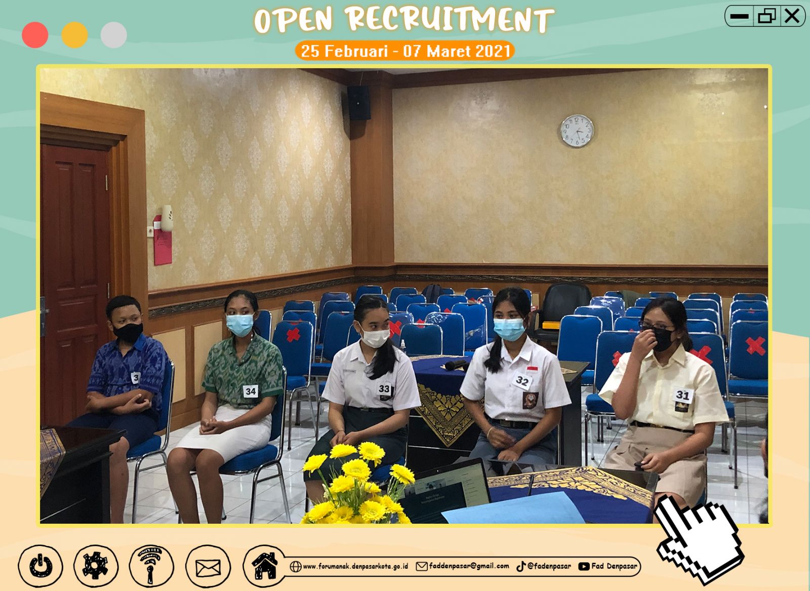 ????Sistem Open Recruitment kali ini diawali dengan pendaftaran melalui sistem online???? yang dibuka pada tanggal 25-28 Februari 2021. Setelah melalui tahap pendaftaran peserta akan melanjutkan tahap selanjutnya yaitu ??????tes wawancara yang dilaksanakan pada ????tanggal 03 Maret 2021 di Dinas P3AP2KB Kota Denpasar. Tes wawancara ini dibagi menjadi 4 sesi dimana setiap sesinya berisikan 10 orang, dan ????waktu pelaksanaan setiap sesinya tidak bersamaan. Dengan diadakannya tes ini diharapkan para peserta dapat mengembangkan potensi public speaking dan juga dapat mengetahui potensi peserta lebih dalam.