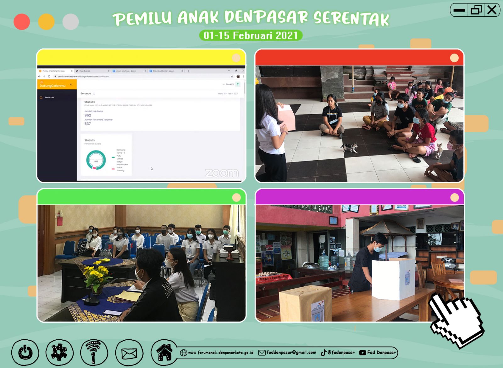 ????Sampai dengan puncak Pemilu Anak Denpasar yaitu pada 15 Februari 2021, dilangsungkan pemungutan suara????, penghitungan suara????, dan ????pengumuman yang terpilih menjadi Ketua dan Wakil Ketua FAD Kota Denpasar dan Ketua FA Kecamatan se-Kota Denpasar. Pemilihan dilakukan secara online melalui e-vote???? dimana seluruh anak Kota Denpasar dapat berpartisipasi menggunakan hak suara pilih mereka untuk memilih ketua dan wakil ketua Forum Anak Daerah Kota Denpasar dan ketua Forum Anak Kecamatan se-Kota Denpasar. Selain itu Forum Anak Daerah Kota Denpasar juga khusus melaksanakan kegiatan pemilihan offline yang melibatkan anak–anak berusia minimal 13 tahun dan maksimal 17 tahun dari beberapa panti di Kecamatan Denpasar untuk menggunakan hak suara pilih mereka?.